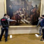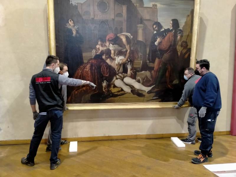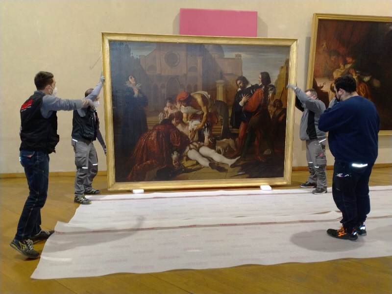 In vista della mostra fiorentina, il grande dipinto raffigurante “Lorenzino de’ Medici assassinato nella piazza di San Giovanni e Paolo a Venezia” (1840) di Giuseppe Bezzuoli, assicurato per mezzo milione di euro secondo la formula 'da chiodo a chiodo' con le più ampie garanzie, ha lasciato stamattina la grande sala rossa dell’Ottocento del Museo Civico, all’ultimo piano del Palazzo Comunale, affidato alle sapienti mani dei tecnici della ditta Apice, specializzata nella movimentazione di opere d'arte.