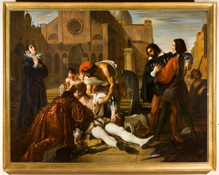 La grande tela pistoiese, che proviene dalla collezione Puccini, raffigura l'uccisione avvenuta a Venezia, ad opera dei sicari del duca Cosimo di Lorenzino de' Medici, assassino a sua volta di Alessandro, tiranno di Firenze. Si tratta di uno degli esempi più elevati del romanticismo storico toscano, nel quale la morte improvvisa, causa di strazio per le donne e per gli amici, riscatta il protagonista dal suo precedente atto tirannicida.