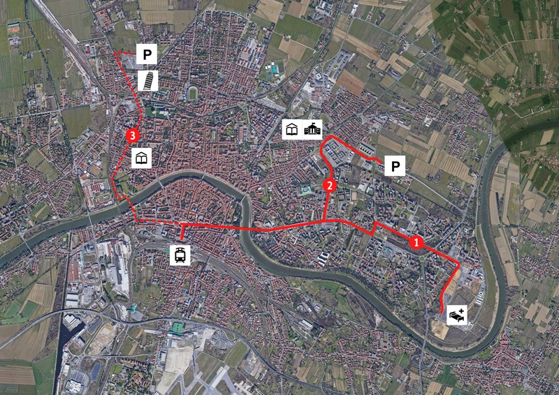 Ipotesi percorso n. 3: Stazione – parcheggio scambiatore via Pietrasantina. L’ipotesi allo studio prevede la realizzazione del percorso n.3 che parte dalla Stazione Centrale di Pisa e arriva fino al parcheggio scambiatore di via Pietrasantina, percorrendo la direttrice di via Bonanno, a servizio dell’area monumentale e del complesso di flussi turistici che ruotano intorno a piazza dei Miracoli. Il tracciato, che è ancora in fase di studio, prevede un’estensione di circa 3,1 chilometri. Parte dalla Stazione Centrale, percorre via Cesare Battisti, per poi svoltare in via Porta a Mare e traversare l’Arno utilizzando il Ponte della Cittadella. Una volta superata l’area della Cittadella e del Museo delle Navi Antiche, prosegue lungo le mura storiche percorrendo via Bonanno fino ad arrivare a piazza Manin, all’ingresso dell’area monumentale di piazza dei Miracoli, e proseguire poi verso via Pietrasantina, fino a raggiungere il parcheggio scambiatore.