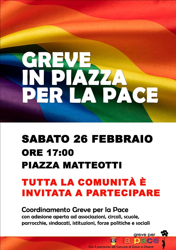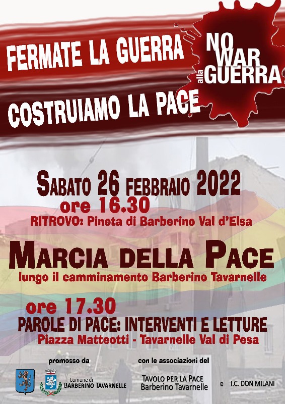 Da domani, sabato 26, a domenica 27 si alterneranno nelle piazze e per le vie dei centri storici dei tre Comuni iniziative di protesta pacifica contro la guerra, accompagnate da letture e interventi istituzionali. A Greve in Chianti piazza Matteotti accoglierà l'evento organizzato dal Coordinamento per la Pace e patrocinato dal Comune, in programma sabato 26 febbraio alle ore 17. A Barberino Tavarnelle la comunità si mette in marcia lungo il camminamento che unisce Barberino Val d'Elsa e Tavarnelle Val di Pesa nell'ambito di un'iniziativa promossa dal Comune, in collaborazione con le associazioni del Tavolo per la pace e l'Istituto comprensivo Don Lorenzo Milani. L'iniziativa è prevista sabato 26 febbraio alle ore 16:30 in partenza dalla pineta di Barberino Val d'Elsa con arrivo in piazza Matteotti a Tavarnelle alle ore 17:30 dove sono attese le letture di alcuni rappresentanti delle associazioni locali.