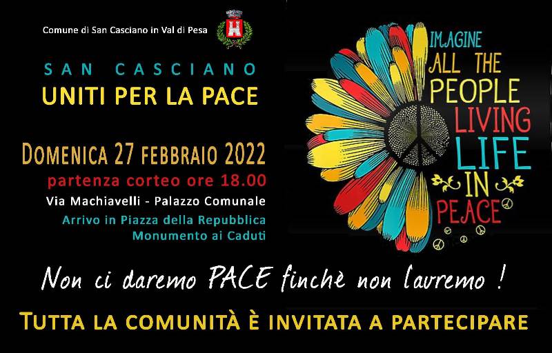 A San Casciano domenica 27 febbraio alle ore 18 si snoderà un corteo per le vie del centro storico con ritrovo in via Machiavelli davanti al Palazzo comunale. L'iniziativa poi culminerà in piazza della Repubblica davanti al Monumento ai Caduti con un’alternanza di interventi istituzionali. “Invitiamo tutti a partecipare e ad aderire alle manifestazioni del Chianti contro la violenza - commentano - siamo tutti chiamati al dovere civile e morale di opporre uno stop forte e deciso alla guerra esortando il governo a promuovere un accordo politico tra le parti che riconduca la pace nel paese europeo invaso dalla Russia”. Nell'esprimere forte preoccupazione per il dramma che si sta consumando nell'Europa dell'est i sindaci invitano inoltre i cittadini ad esporre all'esterno delle loro abitazioni le bandiere con i colori della pace, “un piccolo ma significativo gesto - aggiungono - che testimonia l’unità di intenti e la nostra vicinanza a tutti coloro che sentono minacciato il diritto alla vita, non ci daremo pace se non la otterremo”. Le comunità del Chianti sono invitate a partecipare alle iniziative contro l’aggressione russa in Ucraina.