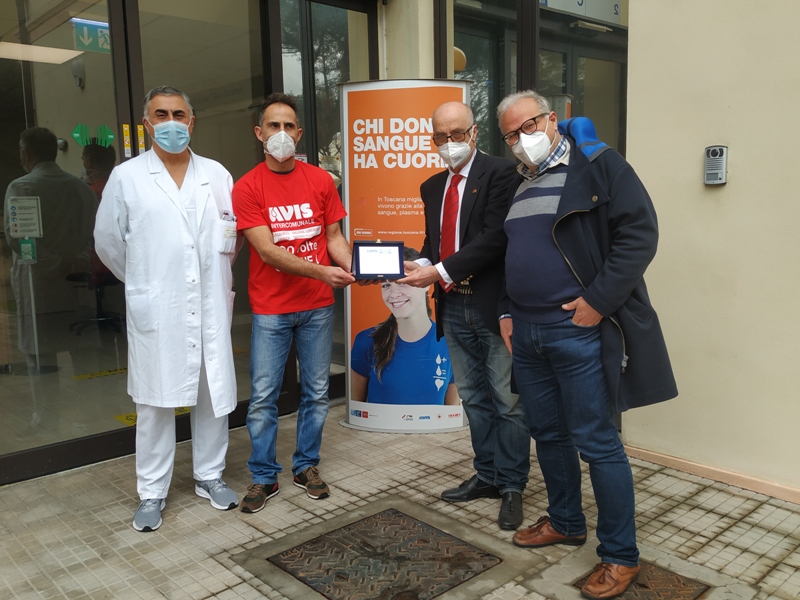 Nella foto di gruppo, da sinistra, troviamo Alessandro Mazzoni (direttore dell'unità operativa Medicina trasfusionale e biologia dei trapianti, Aoup), Simone Giorgi, Maurizio Ceccotti, Michele Cristofano (direttore f.f. della Direzione medica di presidio, Aoup).