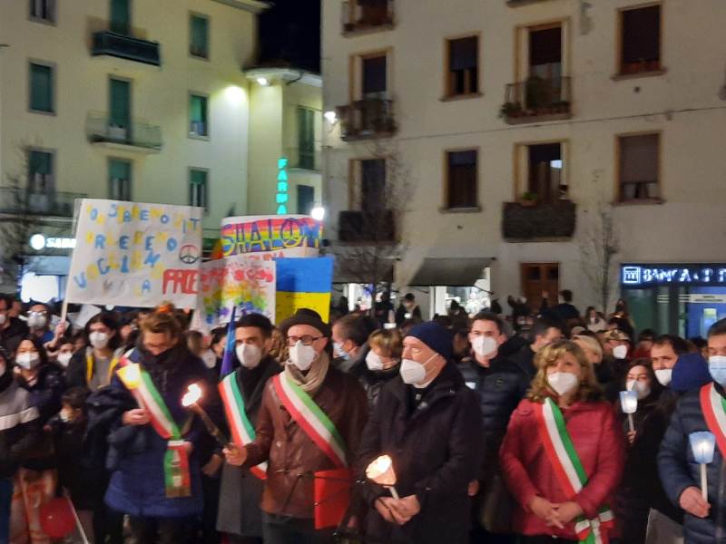 Centinaia di persone questo pomeriggio a Fucecchio hanno risposto all'appello dell'amministrazione comunale a cui si sono unite le associazioni, le contrade e le scuole, per dire No alla guerra in Ucraina. Una fiaccolata ha percorso le vie del centro, da piazza La Vergine a piazza Montanelli accompagnata da striscioni, cartelli e tante bandiere della pace. Nutritissima la presenza di giovani e di famiglie con una partecipazione che è andata ben oltre le attese degli organizzatori.
