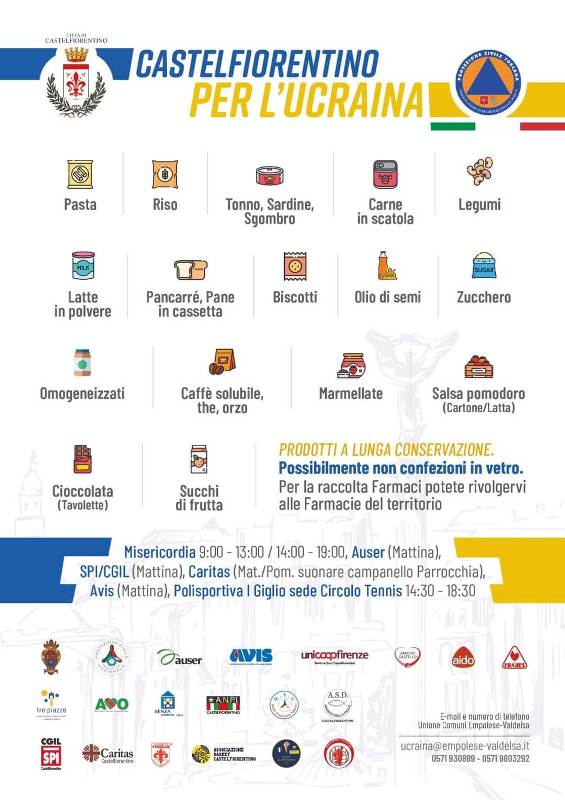 Castelfiorentino si mobilita per l’Ucraina. Sono ormai diversi giorni che le numerose associazioni del territorio, d’intesa con il Comune, si sono messe in moto per aiutare la popolazione ucraina in fuga dalla guerra. In questa prima fase, l’attività principale è stata quella di unire le forze e organizzare una raccolta di generi alimentari a lunga conservazione, contando sul buon cuore degli abitanti di Castelfiorentino da sempre pronti a dare una mano al prossimo nelle situazioni di emergenza.
