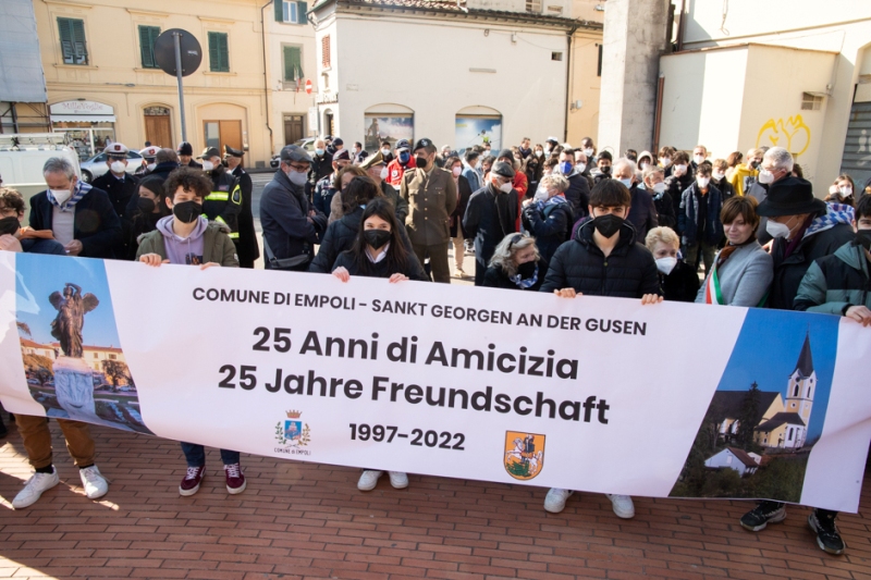 Presenti le scuole, con alcune classi della secondaria Busoni, che hanno omaggiato l’anniversario portando un grande cartellone con su scritta la data dei venticinque anni di amicizia con Gusen.