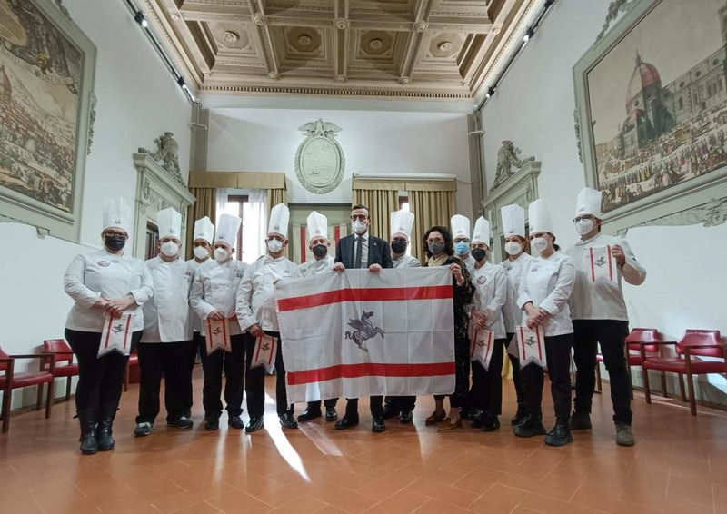 Una piccola riproduzione del Pegaso e la bandiera della Toscana, questa mattina, in Consiglio regionale ai rappresentanti dell’Unione regionale cuochi toscani che dal 27 al 30 marzo, a Rimini, porteranno la Toscana ai campionati di cucina italiana. A consegnarlo è stato il presidente dell’assemblea legislativa Antonio Mazzeo, insieme alla consigliera regionale Lucia De Robertis.