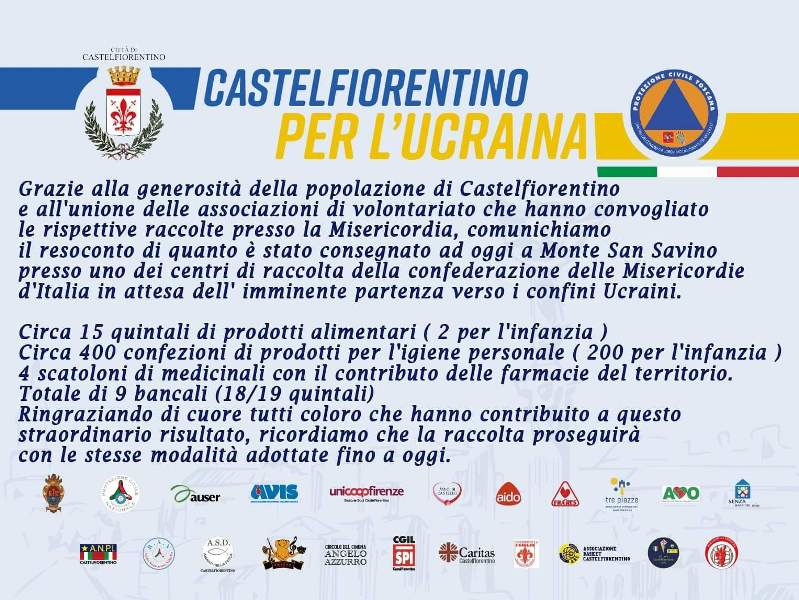 Castelfiorentino sta offrendo una grande prova di generosità nei confronti della popolazione ucraina, devastata dalla guerra in corso e costretta ad abbandonare la propria terra. Il Comune e la Protezione Civile (Prociv Arci) hanno infatti reso noti i primi dati degli aiuti, convogliati presso la Miserircordia, che sono davvero significativi.Nel giro di una settimana, le associazioni di volontariato che si sono messe a disposizione per partecipare alle operazioni di raccolta hanno messo insieme circa 19 quintali di generi di prima necessità, così ripartiti: quindici quintali di prodotti alimentari (di cui 2 per l’infanzia), circa 400 confezioni per l’igiene personale (200 per l’infanzia), 4 scatoloni di medicinali con il contributo delle farmacie del territorio, per un totale di 9 bancali di materiale (18/19 quintali)I generi di prima necessità che sono stati raccolti sono stati inviati a Monte San Savino presso uno dei centri di raccolta della Confederazione delle Misericordie d’Italia, in attesa dell’imminente partenza presso i confini ucraini.“Ringraziando di cuore tutti coloro che hanno contruibuito a questo risultato – si legge nella nota diffusa attraverso i canali “social” – ricordiamo che la raccolta continuerà con le stesse modalità adottate fino a oggi”.Si chiede pertanto di donare soprattutto generi come pasta, riso, tonno, sardine, sgombri, carne in scatola, legumi, latte in polvere, pancarrè, pane in cassetta, biscotti, olio di semi, zucchero, omogeneizzati, caffè solubile, the, orzo, marmellate, salsa di pomodoro, cioccolata in tavoletta, succhi di frutta. Per quanto possibile, si chiede di evitare il vetro come contenitore, anche se alcuni prodotti (omogeneizzati o marmellate, per fare alcuni esempi) sono più difficili da reperire senza vetro.Il materiale può essere consegnato presso: Misericordia (via Palestro 9:00-13:00/14:00-19:00); AUSER (Piazza Gramsci 14, mattina); SPI CGIL (piazza delle Fiascaie, mattino); Caritas (mattina/pomeriggio, suonare al campanello della Parrocchia), AVIS (Piazza Gramsci, mattina), Polisportiva I Giglio (sede Circolo Tennis 14:30-18:30)Si ricorda, inoltre, che presso le farmacie del territorio è attiva la raccolta dei medicinali.Le associazioni e il Comune hanno invitato tutte le famiglie di Castelfiorentino a esporre dalle finestre e dai balconi la bandiera della pace.Le associazioni di Castelfiorentino che hanno aderito a questa iniziativa umanitaria sono ben ventidue. Protezione Civile PROCIV-Arci, Arciconfraternita di Misericordia, AUSER, AVIS, UniCoop - sezione soci Castelfiorentino, Amici di Castello, AIDO, Fratres, ANPI, SPI-CGIL, Associazione CCN “Tre Piazze”, AVO, Senza Barriere, RAV, A.S.D. - Amanti della Pesca, Caritas, Polisportiva I Giglio, ABC - Associazione Basket Castelfiorentino, Castelfiorentino Calcio, Pallavolo I Giglio, TRIVIA, Angelo Azzurro, Gatteatro,Si ricorda che la protezione civile dell'Unione dei Comuni ha attivato i numeri di telefono 0571/930889 e 0571/9803292 e la mail ucraina@empolese-valdelsa.it per fornire informazioni ed indicazioni.