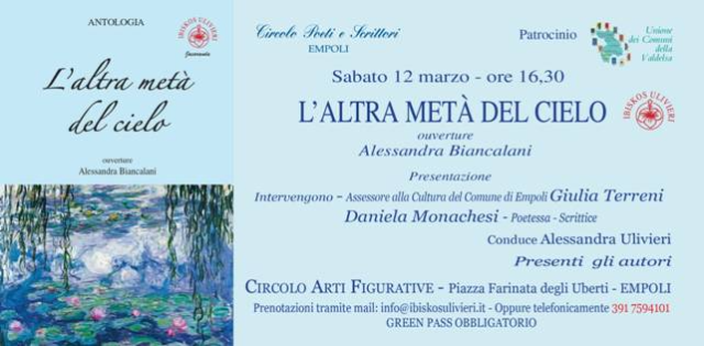Sabato 12 marzo ore 16,30 al Circolo Arti Figurative di piazza Farinata degli Uberti a Empoli si terrà 'L'altra metà del cielo', ricordando Alfonsina Storni, poetessa e scrittrice. Nella locandina in alto trovate tutte le info utili.