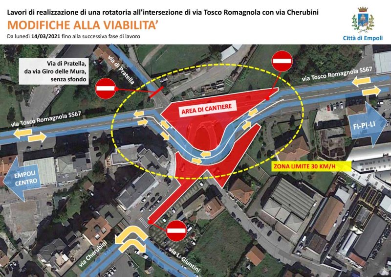 Si ricorda che è attivo il percorso alternativo di via Giuntini e via Dallapiccola: per chi proviene da Empoli lungo via Cherubini sarà obbligatoria la svolta a destra in via Giuntini per raggiungere via Tosco Romagnola attraverso la rotonda di via Dallapiccola. Per chi proviene dalla SCG FI.PI.LI e vuole raggiungere Empoli e via Cherubini, sarà possibile svoltare in via Dallapiccola dalla rotonda e accedere a via Cherubini da via Giuntini.