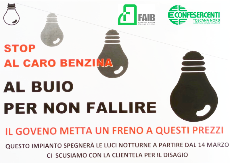 Dopo la lettera inviata ai parlamentari del territorio, i benzinai aderenti a Faib Confesercenti Toscana Nord mettono in campo un’altra protesta contro il caro-carburante: gli impianti carburanti con self-service rimarranno al buio durante le ore notturne a partire da lunedì 14 marzo.