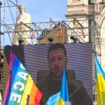 - Il presidente dell’Ucraina Volodymyr Zelenskyj in collegamento alla manifestazione di Firenze (foto gonews.it)