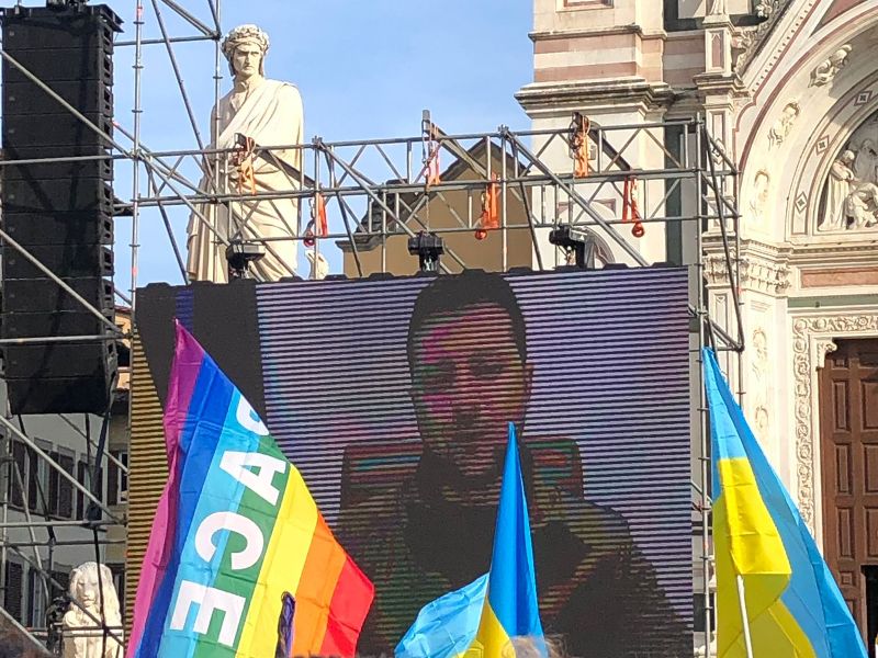 Il presidente dell'Ucraina Volodymyr Zelensky in collegamento alla manifestazione di Firenze (foto gonews.it)