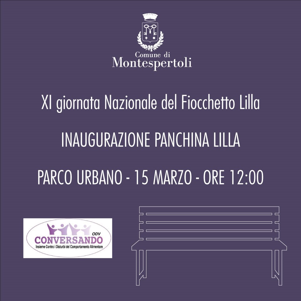 “L’Associazione Conversando, che da diciotto anni è in prima linea per dare sostegno a coloro che si trovano ad affrontare un disturbo alimentare in famiglia, ringrazia il Comune di Montespertoli che ha accolto l’invito a partecipare alla celebrazione della XI Giornata Nazionale del Fiocchetto Lilla colorando del colore lilla, simbolo ormai dei Disturbi dell’Alimentazione e della Nutrizione, una panchina di un proprio giardino. Per chi passerà, la vedrà e la rispetterà, starà a significare che anche il Comune è impegnato nella campagna di diffusione e di sensibilizzazione di tutta la popolazione su queste patologie che fanno soffrire un numero elevatissimo di persone. Con gratitudine.” aggiunge il Presidente dell'associazione, Silverio Spitaleri.