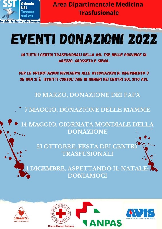 Nell’occasione, i centri trasfusionali e le strutture di raccolta aderenti saranno addobbati a tema e verrà consegnato ai papà che parteciperanno un piccolo dono. L’iniziativa rientra in un calendario di eventi organizzati dalla Asl Toscana sud est in tutte e tre le province.