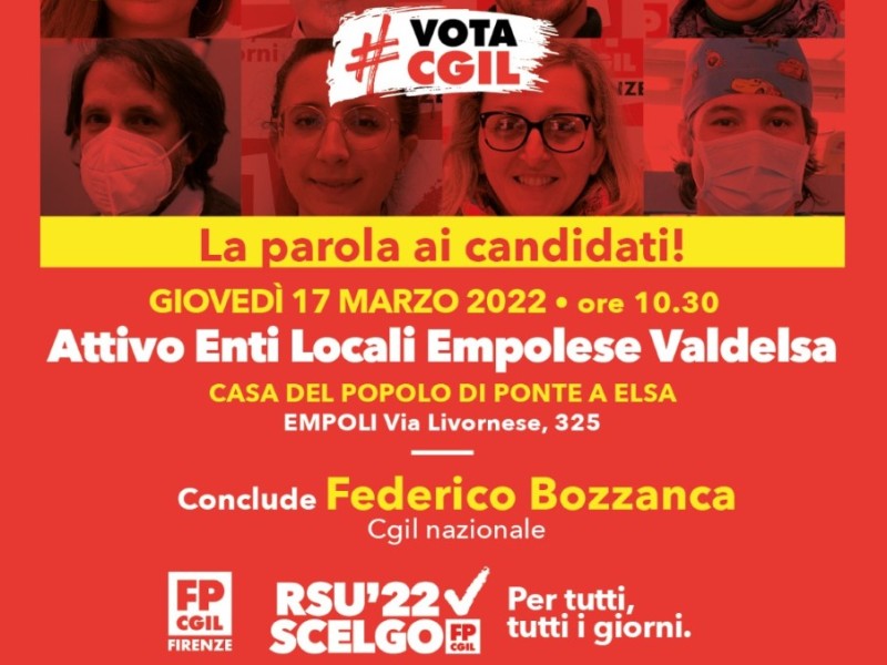 Il giorno 22 marzo 2022 alle ore 10,30 presso la Casa del Popolo di Ponte a Elsa si terrà l'Assemblea Pubblica di presentazione di tutti i candidati della Funzione Pubblica Cgil per gli Enti Locali dell'Empolese Valdelsa.