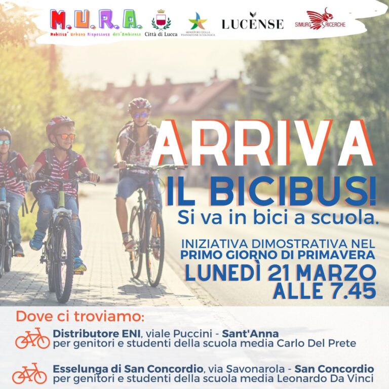 A Lucca si va a scuola in bici. Dopo il pedibus, infatti, arriva anche il bicibus. L’iniziativa è inserita nel progetto M.U.R.A. Mobilità Urbana rispettosa dell’Ambiente, promosso dal Comune di Lucca, finanziato dal Ministero della Transizione Ecologica e realizzato insieme a Lucense e Simurg Ricerche. Uno strumento che punta a valorizzare l’uso dei mezzi ecologici per gli spostamenti tra casa e scuola. Si parte lunedì 21 marzo, primo giorno di Primavera e giornata tradizionalmente dedicata dall’amministrazione comunale al pedibus, con un’iniziativa dimostrativa che il Comune rivolge ai genitori e agli studenti dei due istituti comprensivi inseriti nel progetto: l’istituto Lucca 2, con la scuola media “Leonardo Da Vinci”, e l’istituto Lucca 3, con la scuola media “Carlo Del Prete”. Partire con il bicibus proprio il 21 marzo permette sia di “festeggiare” il successo che negli anni ha riscosso il progetto del pedibus, che ha visto crescere il numero delle scuole partecipanti, sia di lanciare la nuova iniziativa coinvolgendo genitori e studenti delle scuole medie.