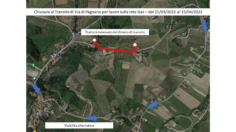 Dalle 8 di lunedì 21 marzo alle 19 di venerdì 15 aprile 2022, Via di Pagnana, solo in un tratto, sarà interessata da alcune modifiche temporanee di viabilità, al fine di consentire lavori di estensione sulla rete del gas e allaccio utenza per conto della società Toscana Energia.Verrà posto il divieto di transito di tutti i veicoli eccetto quelli necessari all’attività che dovranno svolgersi.Per gli utilizzatori di Via Pagnana la viabilità alternativa è garantita da Via del Crudele d'Ormicello.Al termine delle operazioni il tratto sarà regolarmente riaperto al transito veicolare.