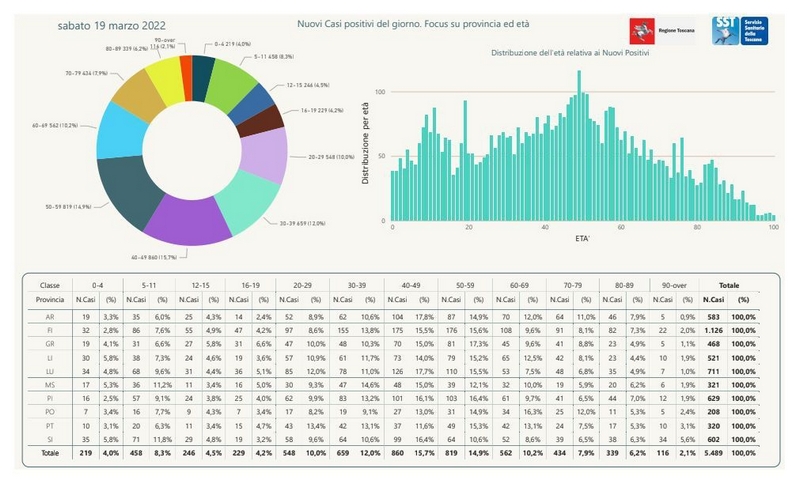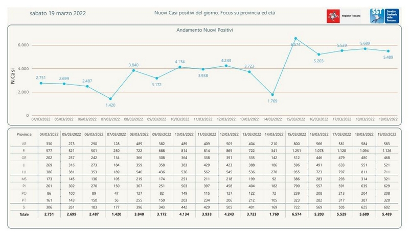 Contagi 19 marzo. I nuovi casi registrati in Toscana sono 5.489 su 32.319 test di cui 7.543 tamponi molecolari e 24.776 test rapidi. Il tasso dei nuovi positivi è 16,98% (61,0% sulle prime diagnosi). Sono questi i dati resi noti in anticipo dal presidente della Regione Toscana, Eugenio Giani, in anticipo rispetto al bollettino quotidiano della Regione con tutti i dati completi. Rispetto a ieri si registra un calo dei nuovi contagi.