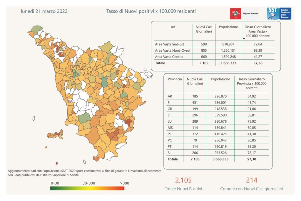 Contagi 21 marzo. I nuovi casi registrati in Toscana sono 2.105 su 11.889 test di cui 5.199 tamponi molecolari e 6.690 test rapidi. Il tasso dei nuovi positivi è 17,71% (51,9% sulle prime diagnosi).Sono questi i dati resi noti dal presidente ella Regione Toscana, Eugenio Giani, in anticipo sul bollettino quotidiano con tutti i dettagli sui contagi della Regione. Rispetto a ieri si registra un calo dei nuovi positivi.