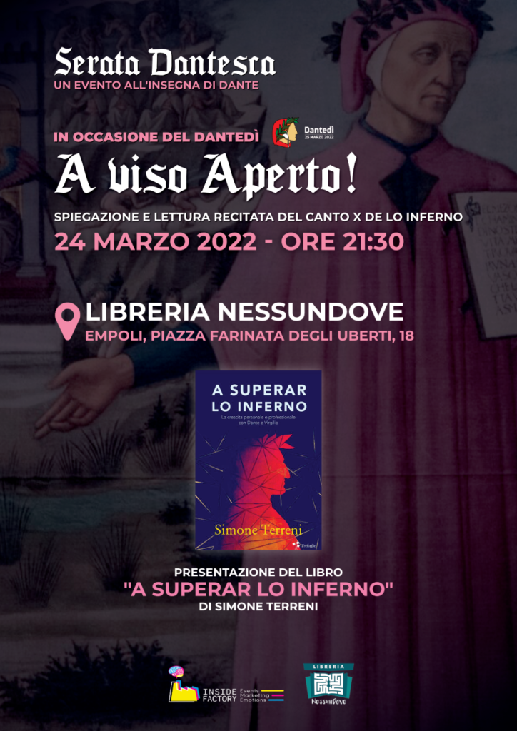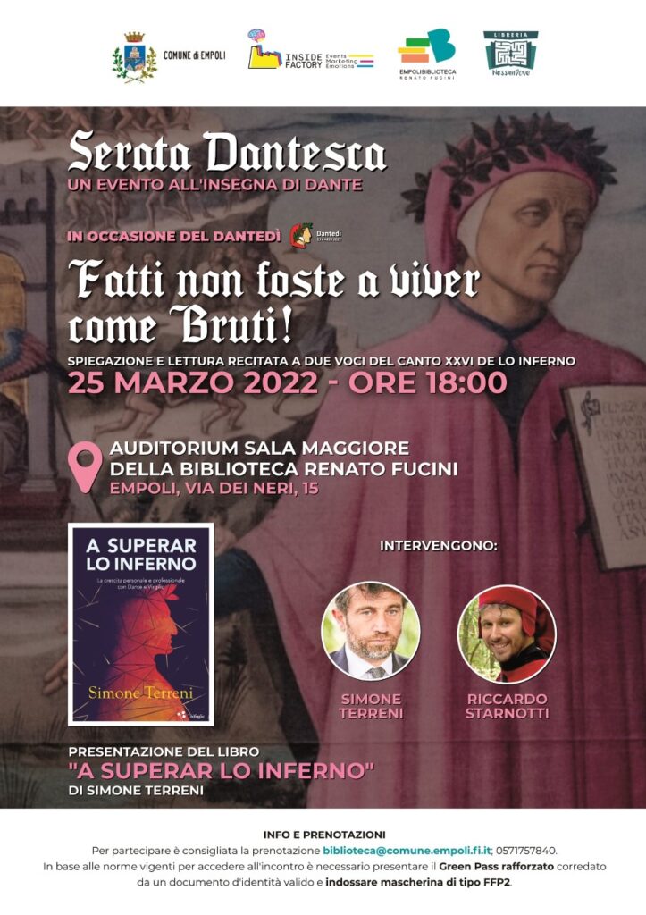 In occasione dei 701 anni dalla morte di Dante Alighieri, l’imprenditore e manager Simone Terreni propone due appuntamenti, giovedì 24 e venerdì 25 marzo, organizzati da Inside Factory in collaborazione con la Libreria NessunDove e la Biblioteca comunale di Empoli in cui attualizzare i canti della Divina Commedia, presentando anche il suo ultimo libro ‘A Superar lo Inferno’ dedicato alla crescita professionale e personale, edito da TréFoglie