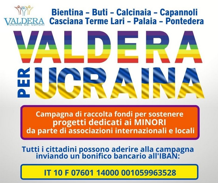 Tutti i cittadini che desiderano fare qualcosa per garantire un futuro più accettabile ai bambini ucraini possono aderire alla campagna “Valdera per Ucraina” promossa dai comuni di Bientina, Buti, Calcinaia, Capannoli, Casciana Terme Lari, Palaia e Pontedera.