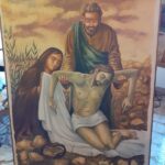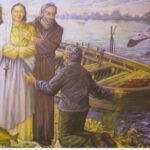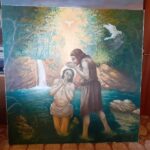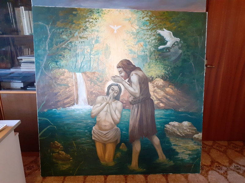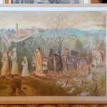 Si tratta di immagini che si legano strettamente all’iconografia sacra, con le posizioni solite del Cristo o di Maria, anche se spesso la loro collocazione è in luoghi particolari, con abiti e contesti che le attualizzano, le rendono vicine. Penso ad esempio al “Viaggio attraverso il Po”, con tre figure poste alla maniera di Maria e due santi, e con un uomo davanti a loro, messo in ginocchio, a braccia aperte e adoranti. Dietro di loro, in secondo piano, c’è una distesa d’acqua, un barchino e un grande uccello acquatico ad ali spiegate, che avvicina la raffigurazione di una scena di vita del padule, quello stesso, che si trova a poche centinaia di metri dalla chiesa di Santa Liberata e da Cerreto.