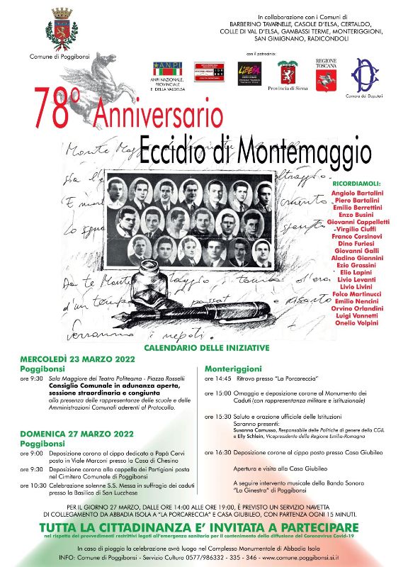 Come ogni anno nove Comuni insieme - Poggibonsi (quest’anno capofila), Barberino Tavarnelle, Casole d'Elsa, Certaldo, Colle di Val d'Elsa, Gambassi Terme, Monteriggioni, Radicondoli e San Gimignano – commemorano l’eccidio con un programma di iniziative che si concludono domenica 27 marzo sul luogo dove la strage venne perpetrata. Nel pomeriggio si svolgeranno le celebrazioni ufficiali con saluti istituzionali e interventi di Susanna Camusso, responsabile delle Politiche di genere della CGIL ed Elly Schlein, Vicepresidente della Regione Emilia-Romagna.