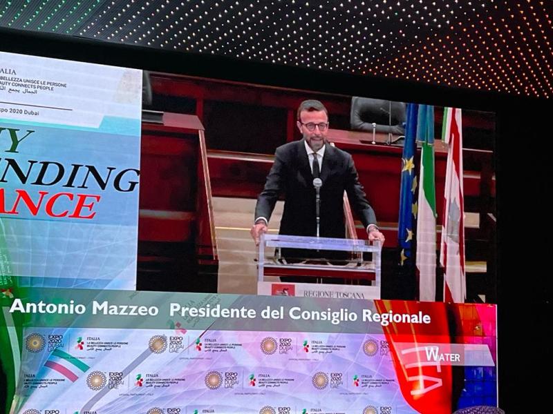 "Il futuro della Toscana passa dal rafforzamento di qualità ed eccellenze", dice Antonio Mazzeo, in collegamento video con Dubai dal palazzo del Pegaso. Il presidente del Consiglio regionale della Toscana è intervenuto in collegamento al convegno "Tuscany, Neverending Renaissance", che si è tenuto questa mattina (sabato 26 marzo) al padiglione Italia dell’Expo di Dubai. Sul posto, in rappresentanza del Consiglio regionale, le consigliere Lucia De Robertis (Pd) ed Elena Meini (Lega), che hanno guidato la delegazione toscana insieme all’assessore regionale Leonardo Marras. Con loro, tra gli altri, il direttore di Toscana promozione turistica, Francesco Tapinassi, e la presidente dell’Unione industriale pisana, Patrizia Pacini, in rappresentanza di Confindustria Toscana.