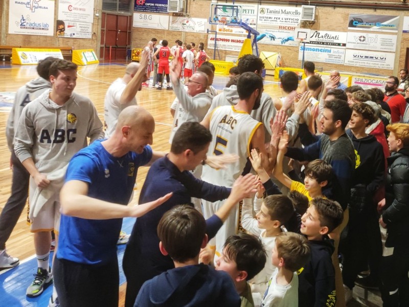 Si arriva all’ultimo quarto, e sulla panchina gialloblu accade qualcosa. Accade che quella speranza cullata fin dalla vigilia diventa qualcosa di diverso: diventa consapevolezza. Allo stesso tempo accade qualcosa anche sulla panchina ospite in cui la pressione inizia a farsi sentire e si tramuta in nervosismo. E qui sta la chiave di volta. Perchè di fatto l’ultimo quarto è un emozionante botta e risposta che, quando parte l’ultimo giro di lancette, vede lampeggiare sul cronometro 64-64. E in questi momenti contano solo due cose: testa e cuore. Il tecnico di Rasio manda in lunetta Pucci per il 65-64, cui risponde Molteni che subisce fallo: 65-66 con 29 secondi sul cronometro. Dal time out esce l’Abc perfetta: l’ultima azione, quando la palla scotta davvero, è una lezione di freddezza e maturità. La palla gira perfettamente e arriva lì dove deve arrivare. Arriva da Scali che, sotto canestro, decide di coronare l’impresa: 67-66. Mancano dieci secondi, Gema ci prova ma stasera niente avrebbe potuto fermare questa Abc. Mamma mia, è tutto vero!