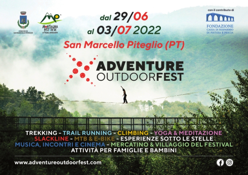 Ogni anno una vivace comunità di appassionati di montagna, di amanti dello stile di vita outdoor e di sport all'aria aperta, ma anche molti curiosi, si riuniscono tra le montagne, per "ri-connettersi" alla natura e celebrare le proprie passioni. Nel 2022 l'Adventure Outdoor Fest torna, grazie al contributo della Fondazione Caript, dal 29 Giugno al 3 Luglio a San Marcello Piteglio, sulla Montagna Pistoiese.