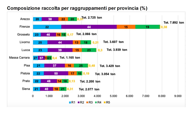 Superano la soglia delle 2.000 tonnellate le raccolte delle province di Siena e di Grosseto: la prima raggiunge le 2.077 tonnellate, in crescita del 9,1% e concentrata soprattutto in R2 (+14,9%) e in R3 (+8,7%),la seconda tocca quota 2.066 tonnellate, con un incremento dell’8,1%, derivante sempre dall’aumento dei volumi in R2 (+6,9%) e in R3 (+20,2%), oltre che in R4 (+9,8%). Ultima posizione per raccolta della provincia di Massa Carrara con 1.165 tonnellate, in crescita del 7,3%.
