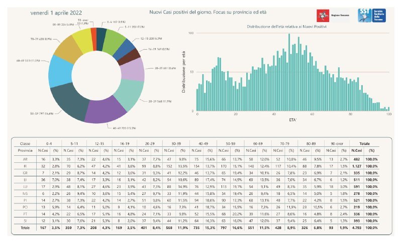 L'età media dei 4.793 nuovi positivi odierni è di 42 anni circa (19% ha meno di 20 anni, 21% tra 20 e 39 anni, 32% tra 40 e 59 anni, 20% tra 60 e 79 anni, 8% ha 80 anni o più).