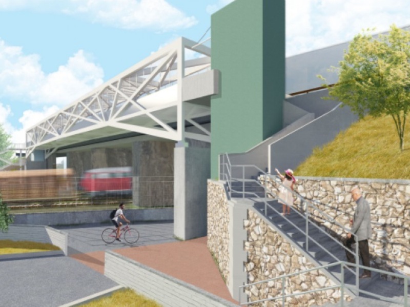 La passerella, costituita in profilati tubolari in acciaio, sarà aperta nella parte superiore e chiusa lateralmente mediante pannelli di lamiera con la finalità di proteggere la sede ferroviaria dalla caduta di oggetti. La pavimentazione della passerella sarà in conglomerato drenante, ecocompatibile, incombustibile e antisdrucciolo. I vani ascensore saranno realizzati in cemento armato a faccia vista, con pensilina leggera di protezione agli ingressi. La scala di accesso sud sarà realizzata mediante profilati in acciaio zincati. La scala nord sarà in parte su terra, in parte a soletta rampante, sarà rivestita in lastre di pietra. In corrispondenza dell’accesso nord, sotto la scala, è previsto un vano parzialmente aperto per l’alloggio dei quadri elettrici e ascensore, dotato di un soppalco in acciaio e lamiera per l’accesso alla manutenzione dei tiranti. E’ prevista inoltre una illuminazione del percorso ciclopedonale, sia dell’interno che dall’esterno.
