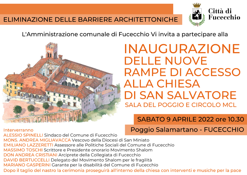 Si tratta di una doppia rampa di accesso che permetterà di superare, anche alle persone con difficoltà deambulatorie, la storica scalinata in pietra che porta alla Chiesa di San Salvatore, all'adiacente Sala del Poggio e al Circolo MCl. Il Comune di Fucecchio, proprietario dell'intero complesso, ha progettato questa importante struttura che permetterà a tutte le persone di accedere ai luoghi di fede e agli altri locali senza difficoltà.