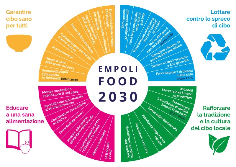 Si chiama Empoli Food2030, una serie di obiettivi in gran parte attuati (siamo all'80%) con i quali la città vuole dare una coerente politica del cibo per garantire pasti sani a tutti, evitare lo spreco nel pubblico e nel privato, educare fin da piccoli a una sana alimentazione e rafforzare la filiera corta e il cibo di zona.