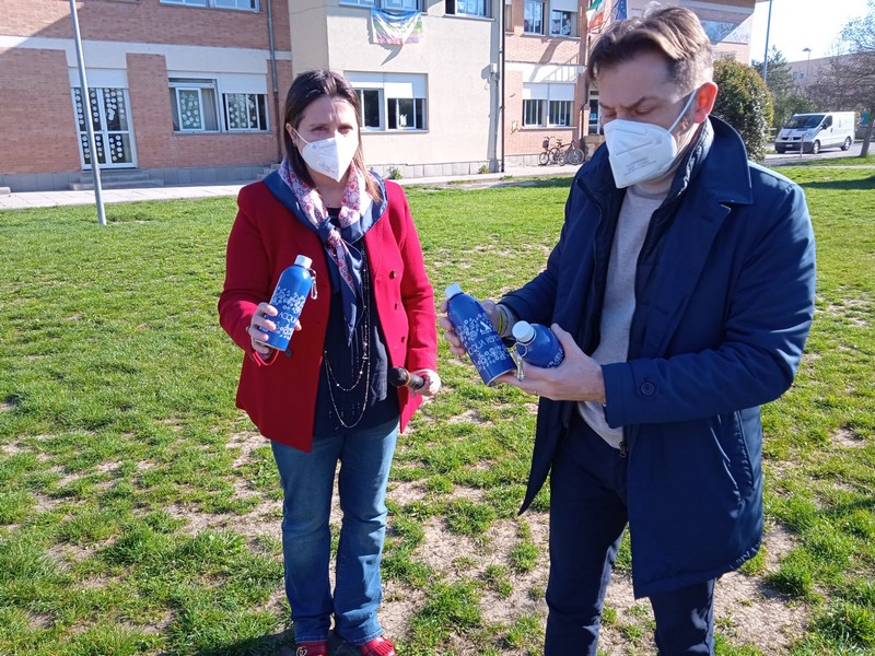 Le borracce consegnate stamani ai bambini, completamente in alluminio, tappo compreso, sono certificate ed eco - compatibili e riportano la scritta "La mia acqua rispetta l'ambiente".