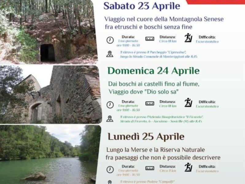 Sabato 23 aprile, il ritrovo è alle ore 08.45 presso il parcheggio "Cipressino", lungo la Strada Comunale di Monteriggioni. Domenica 24 aprile, il ritrovo è alle ore 8.45 presso l'Azienda Bioagrituristica "Il Ficareto", Strada di Ficareto 6, Ancaiano - Sovicille (SI). Lunedì 25 aprile, il ritrovo è alle ore 8.45 presso il Podere "Campalfi", Stigliano - Sovicille (SI).
