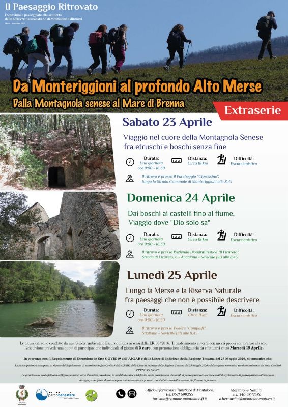 L'insolito itinerario di queste tre date si disloca al di fuori dal territorio di Montaione, e propone gli splendidi percorsi nelle Terre di Siena. In queste tre giornate di escursioni, i partecipanti accompagnati da una guida ambientale, scopriranno i molteplici punti di interesse storico e naturalistico che caratterizzano la Montagnola Senese e la Riserva Naturale dell’Alto Merse.