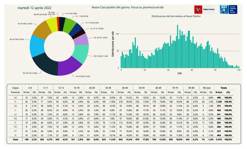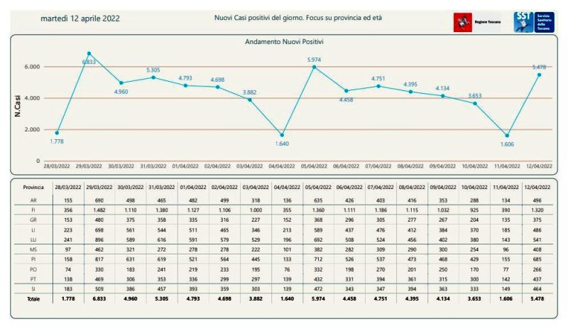 Contagi 12 aprile. I nuovi casi positivi sono 5.478 su 35.283 test di cui 5.033 tamponi molecolari e 30.250 test rapidi. Il tasso dei nuovi positivi è 15,53% (76,3% sulle prime diagnosi). Sono questi i dati sul Covid resi noti dal presidente della Regione Toscana Eugenio Giani in anticipo sul bollettino quotidiano della Regione. Rispetto a ieri i casi sono in forte aumento.