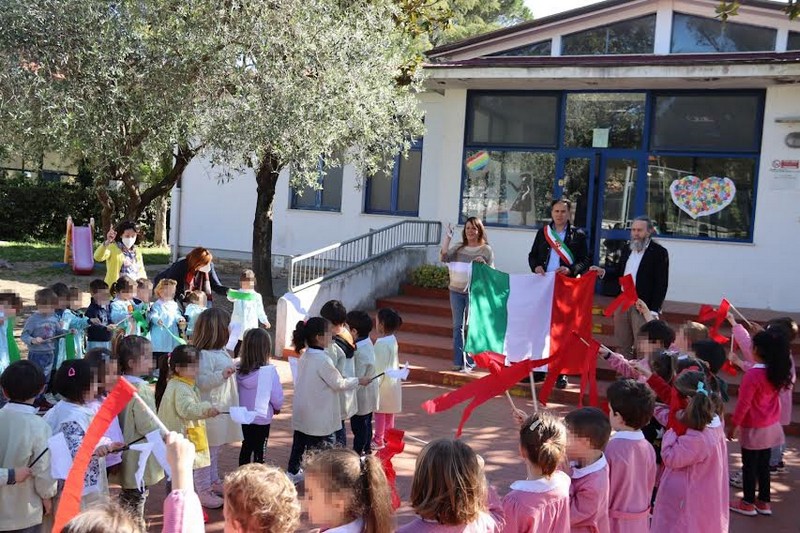 Il sindaco di Pisa Michele Conti, accompagnato dal vicepresidente del Consiglio Comunale Riccardo Buscemi, ha visitato ieri la scuola dell’infanzia "Aldo Capitini" a Pisanova per fare dono della bandiera tricolore da esporre all’esterno dell’edificio. È stata la dirigente dell’Istituto comprensivo "Galilei" Rossana Condello, insieme alla responsabile del plesso scolastico Germana Delle Canne, ad accogliere i due rappresentanti istituzionali, accompagnate dalle insegnanti e dagli alunni della scuola, raccolti nel giardino con variopinte strisce di stoffa verde, bianca e rossa, a formare un grande tricolore. La bandiera donata dal sindaco Conti è stata ricevuta da Lorenzo (sezione rossa), Vittoria (sezione gialla) e Anna (sezione verde) in rappresentanza di tutti i piccoli alunni della scuola.