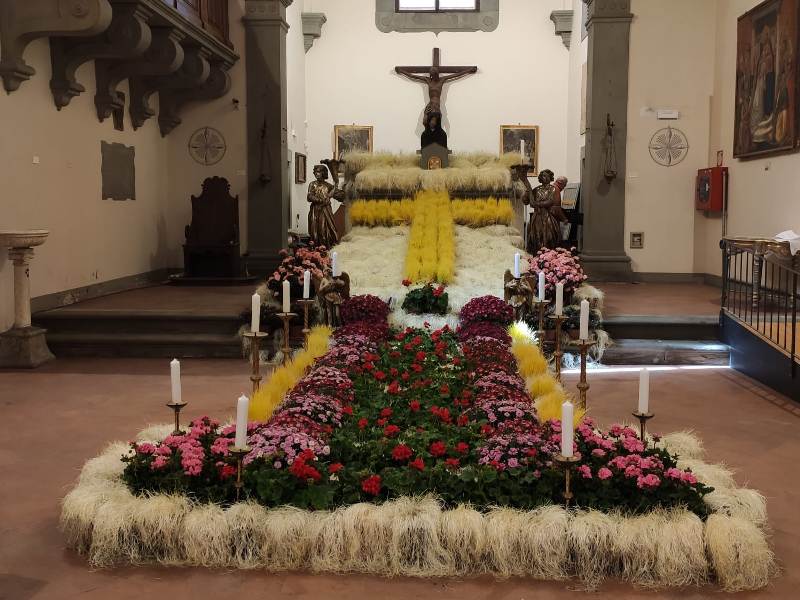 L'antica tradizione delle vecce pasquali di San Casciano, portata avanti dalla comunità locale dagli anni '50, stende tappeti di fiori che si ispirano ai simboli cristiani nelle chiese del capoluogo. Uno spettacolo naturale che evoca i valori della pace e della spiritualità, realizzato da numerosi cittadini. Da questo pomeriggio, giovedì 14 aprile, fino al Lunedì dell’Angelo, prendono vita nelle chiese del Suffragio e della Misericordia del comune chiantigiano i tableau di fiori e profumi che sbocciano insieme all’antica tradizione religiosa del Sepolcro delle Vecce. Ad adornare le antiche chiese sono le ricche composizioni floreali costituite da vecce e grano misti a fiori e piante di stagione quali gardenie, calle, margherite, begonie, ortensie azalee, gerani.