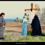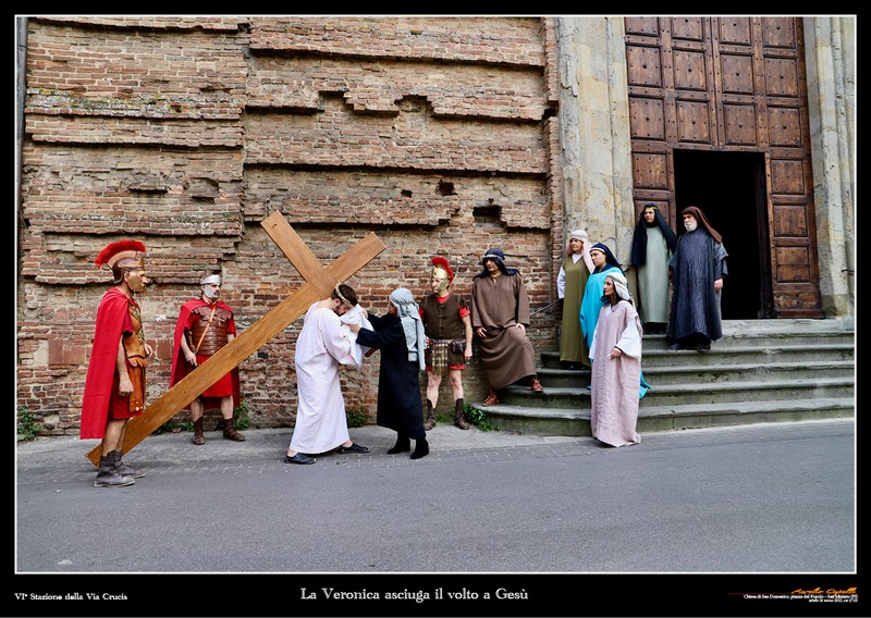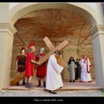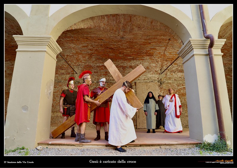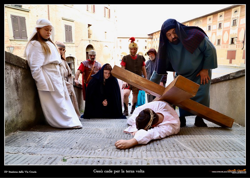 Così, le tre cadute di Cristo sotto la Croce non sono ripetizioni, ma le reiterazioni di una pena sempre più grave, con un crescere della gravità delle cadute. Mentre nell’incontro con le donne di Gerusalemme, il silenzio della condivisione del dolore si manifesta nella fissità degli sguardi sgomenti ed amorevoli. Il prato della Rocca con l’orizzonte che si apre tutto attorno è il luogo della crocefissione, che avviene sotto ad un cielo che si smaterializza nel momento della morte del Cristo, e torna poi a far da cornice alla pietà con cui Maria e le altre donne ricompongono il corpo finalmente pacificato di Gesù.