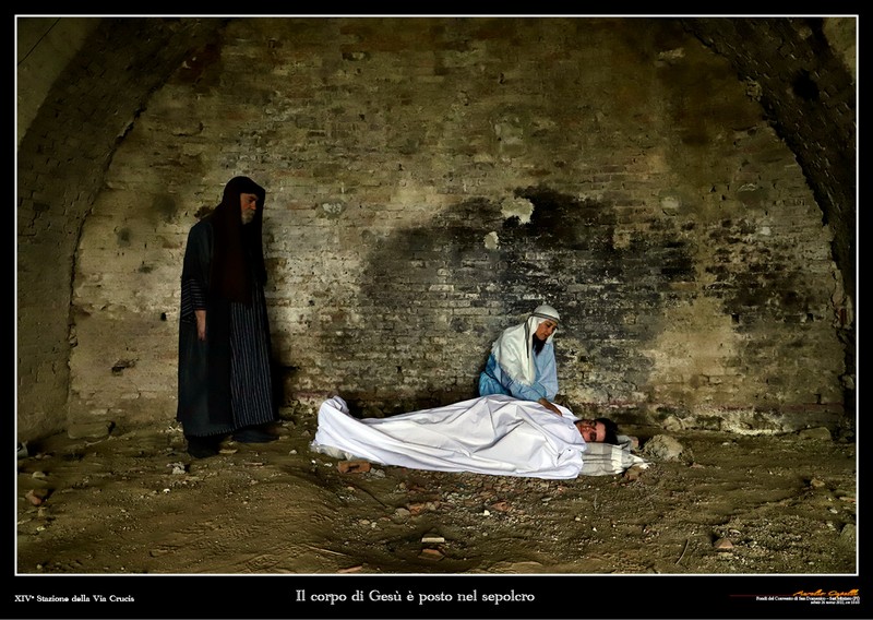 Particolarmente suggestive sono le ultime due immagini. La XXIV stazione, quella della sepoltura, crepuscolare, ambientata nei fondi dell’ex convento di San Domenico, e l’epilogo, la Resurrezione del Signore, nel sepolcro illuminato da una luce appena nata, d’alba, che si rivela vuoto davanti agli occhi delle donne incredule e sgomente.