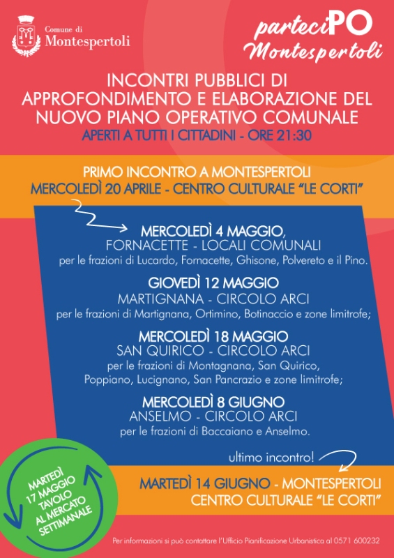 Altro appuntamento sarà quello di Martedì 17 Maggio dove durante il mercato settimanale sarà presente un banchino che potrà spiegare e dare informazioni sul percorso di formazione del nuovo piano operativo.