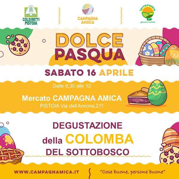 Alla vigilia di Pasqua il mercato di via dell’Annona darà ai pistoiesi l’opportunità di fare un’ottima spesa direttamente dai produttori agricoli, con carni, formaggi, ortofrutta e tanto altro. E a partire dalle 9.30 l’azienda i consumatori presenti potranno degustare (ed eventualmente acquistare) la colomba prodotta dall’azienda agricola Il Sottobosco di Fabio Bizzarri.