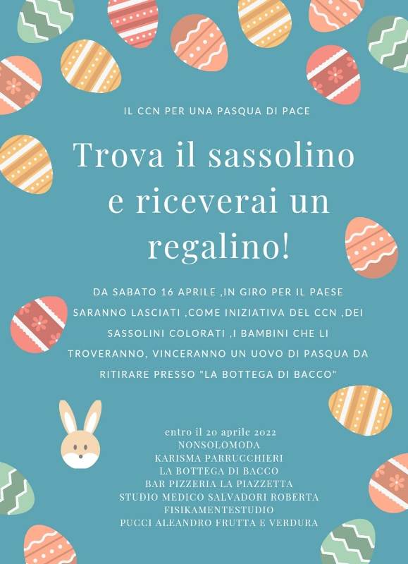 Un post di Facebook, poi, avvisa tutti i bambini della frazione di una caccia al tesoro. Cinque sassolini colorati sono stati nascosti nei vari giardini. A chi li troverà, verrà regalato un uovo di Pasqua che potrà essere ritirato nelle attività commerciali del paese.