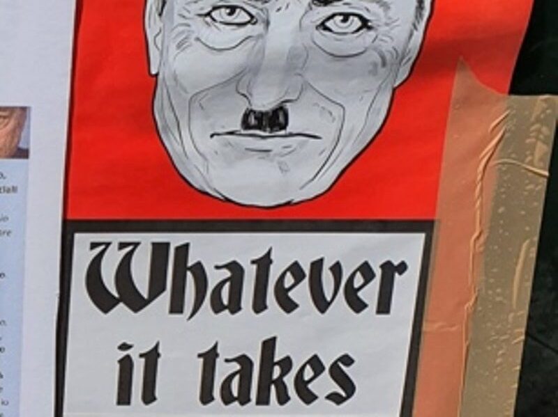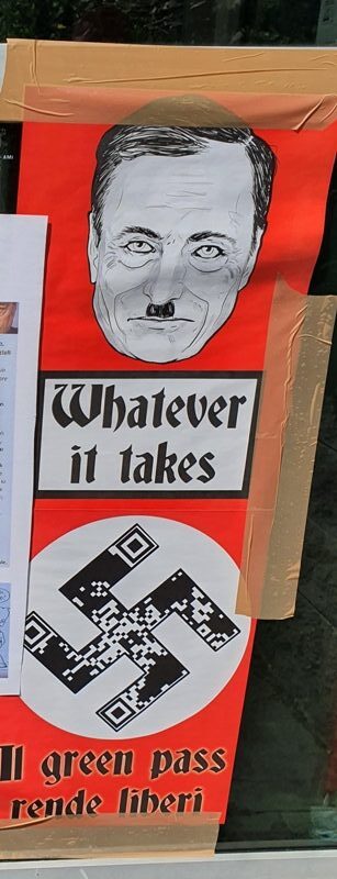 La grave illustrazione è accompagnata dalla frase "Whatever in takes" che significa "Costi quel che costi", pronunciata da Draghi quando ricopriva la carica di governatore della BCE e infine un chiaro messaggio 'no green pass', di cui non si sentiva parlare da qualche tempo anche in virtù, probabilmente, dell'allentamento delle restrizioni. In fondo al volantino altro riferimento al nazismo attraverso una svastica riempita di quadratini bianchi e neri, gli stessi che compongono il Qr Code di un green pass appunto. Chiude il volantino, su sfondo rosso, la scritta sotto il simbolo nazista "il green pass rende liberi".