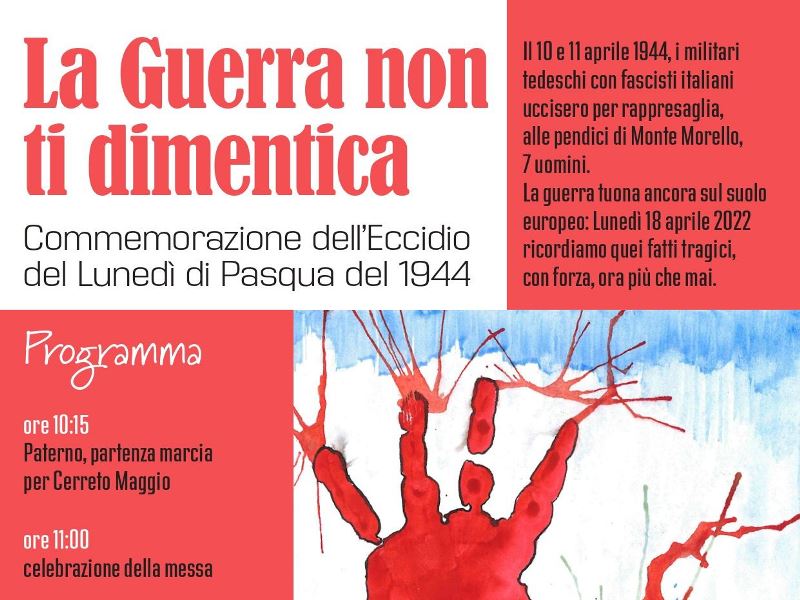 Il programma della commemorazione prevede una marcia per Cerreto Maggio con ritrovo a Paterno alle ore 10.15, alle 11 la celebrazione della messa, alle 11:30 un ricordo dei tragici eventi del 1944, e terminerà alle ore 12 con la deposizione della corona d’alloro al monumento delle vittime.