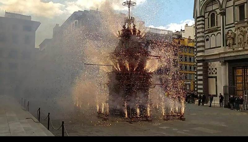 Dopo l'annullamento del 2020 e la cerimonia a porte chiuse del 2021, oggi, domenica 17 aprile, lo Scoppio del Carro è tornato in presenza. Davanti all'arcivescovo Betori e a molte persone, tra cittadini e autorità, si è tenuta la tradizione millenaria di Firenze.