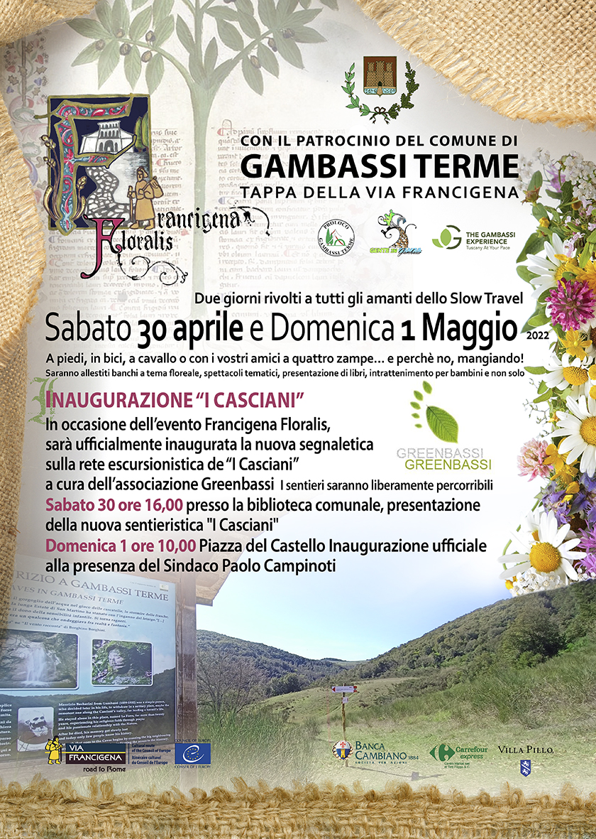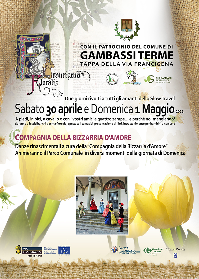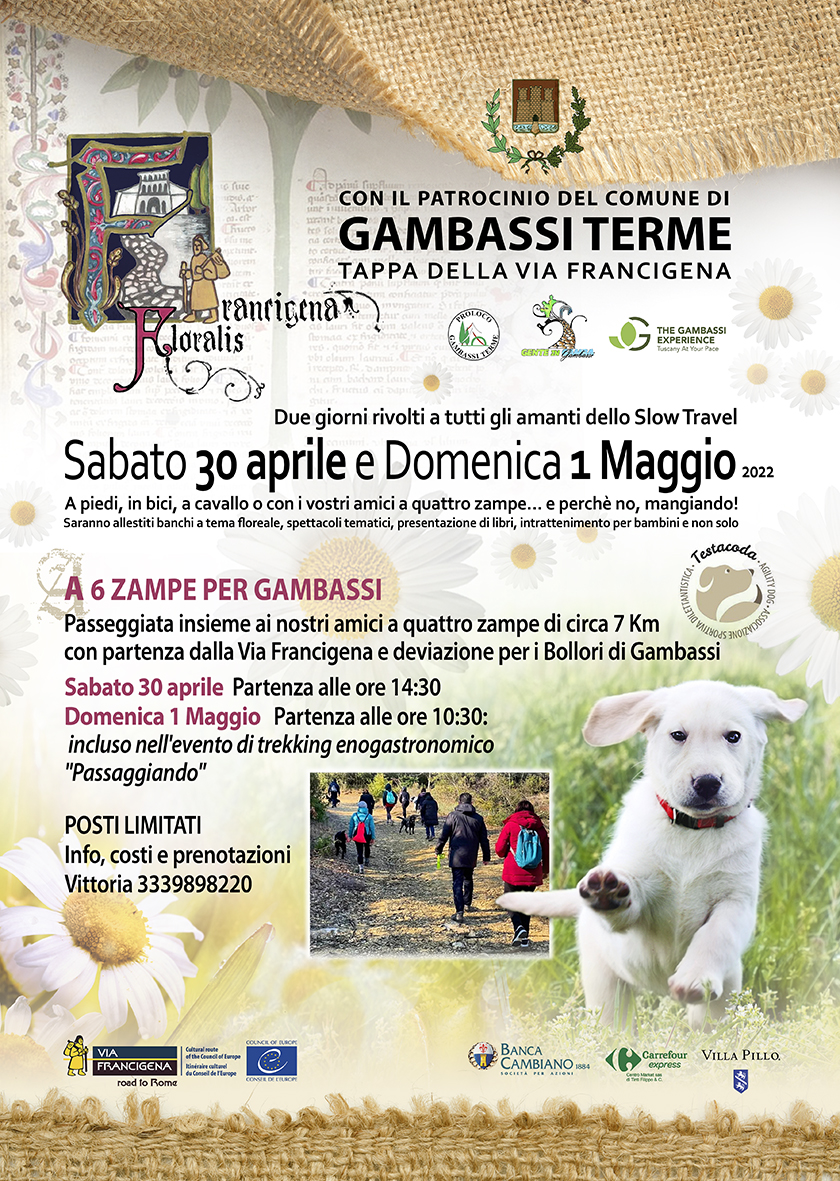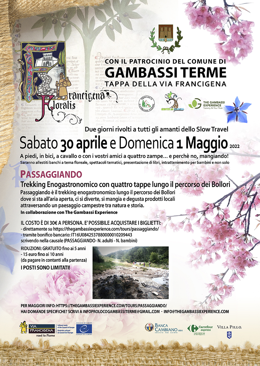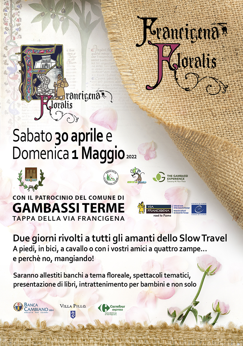 Sabato 30 aprile e domenica 1 maggio Gambassi Terme si animerà con 'Francigena Floralis', la prima edizione della manifestazione dedicata a tutti gli amanti dello slow travel. Tante le iniziative lungo le terre della Valdelsa, nella tappa della Francigena tra natura e storia. Durante gli eventi sarà possibile percorrere i percorsi, in compagnia anche degli amici a quattro zampe, o fermarsi ai banchi allestiti a tema floreale, assistere a spettacoli tematici, presentazioni di libri, intrattenimento per bambini e non solo.